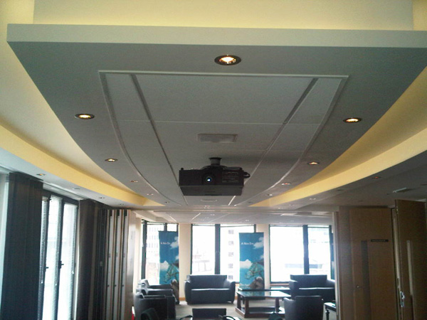 This project involved the installation of new partitioning and ceilings over four floors of offices for Saudi Arabian Airlines. The pictures above show the bespoke ceiling that we installed into the director’s meeting room. This bespoke ceiling mirrors the shape of the boardroom table below and includes recessed lighting and the wiring for a projector.